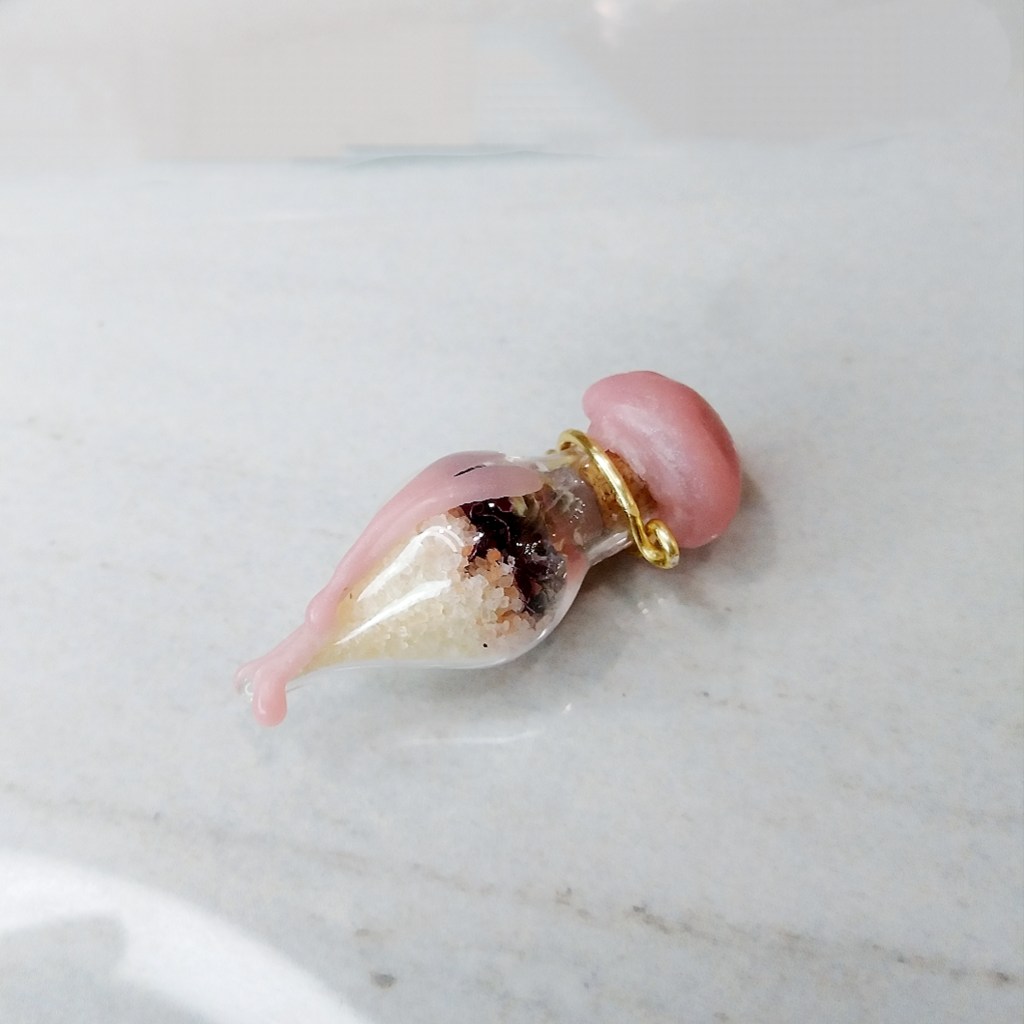 After placing my little bottle, already with the metal wire (which will attach to the dainty chain) around the bottle’s neck, in my self-made witch-bottle-holding-receptacle, I begin the spell. To keep my practices private, I’ll keep what I chant to myself, but know that I am always chanting as I fill the bottle with the specially curated ingredients: